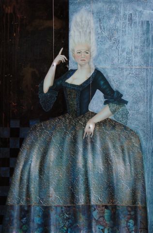 VENDU - Marie-Antoinette, tel une marionnette animée par des fils d’argent; des têtes coupées au pied de sa robe. Le pantin est prit à son propre jeu pour une tête fragile pleine d’horreur.
